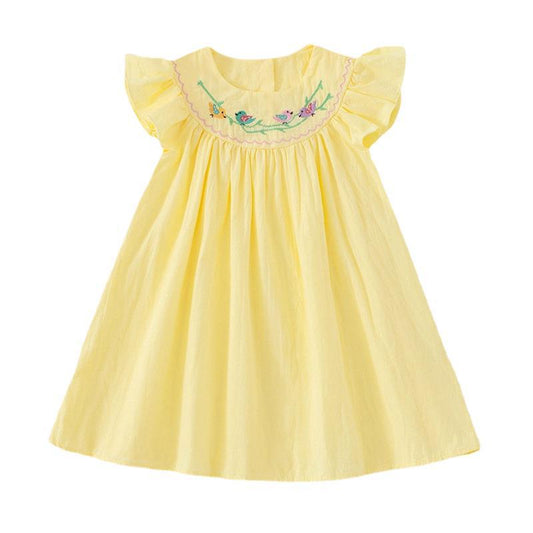 Summer Baby Kids Girls Sleeveless Birds Embroidery Yellow Dress